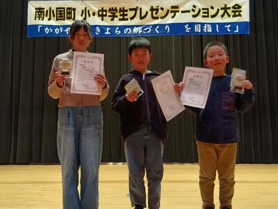 2月1日(土)に第6回南小国町プレゼンテーション大会が開催されました。本校から、3名の子どもたちが出場しました。本番の発表では、校内プレゼン集会の時より内容にも深まりが見られ、相手意識もより増しており、素晴らしいプレゼン発表ができました。何より、南小国町をよりよくしていこうとする気持ちがしっかり伝わってきました。