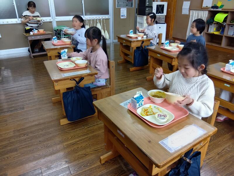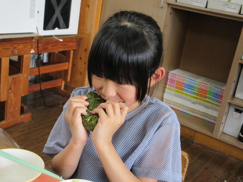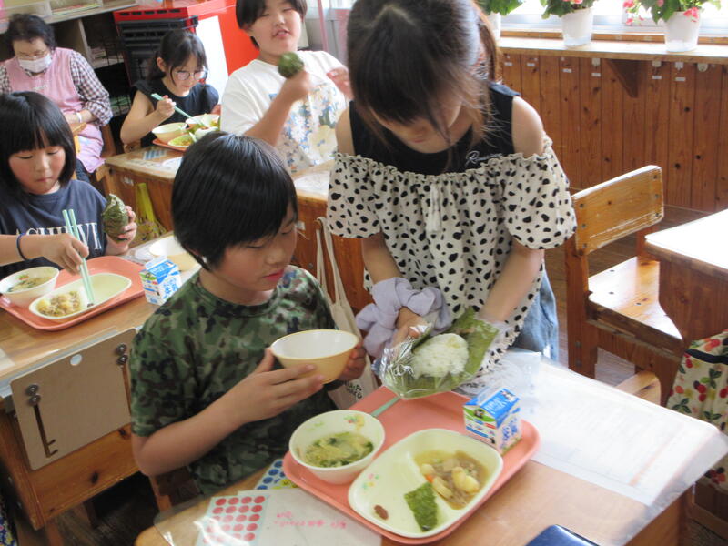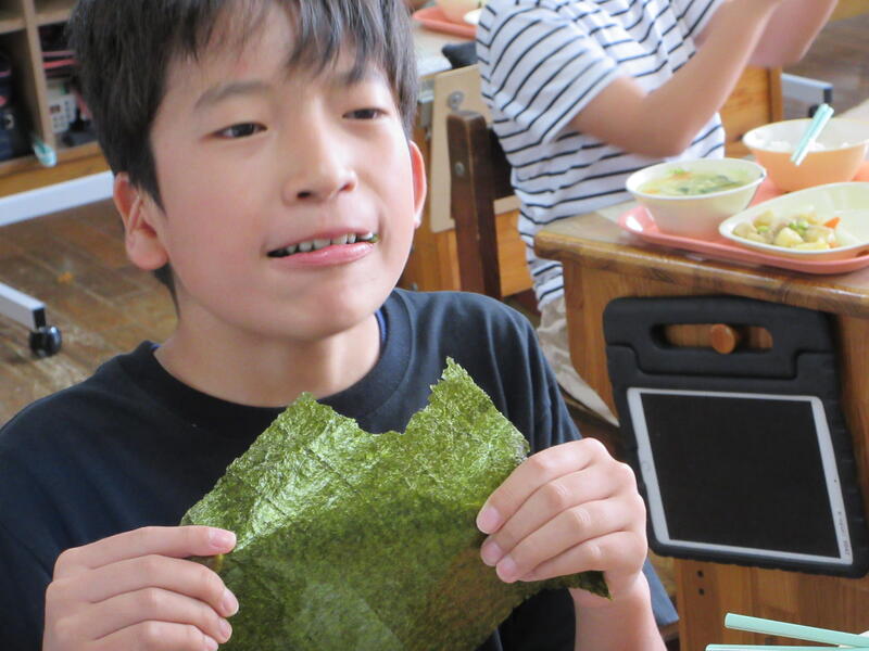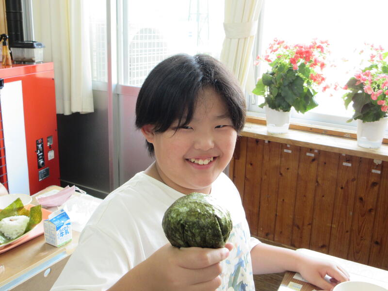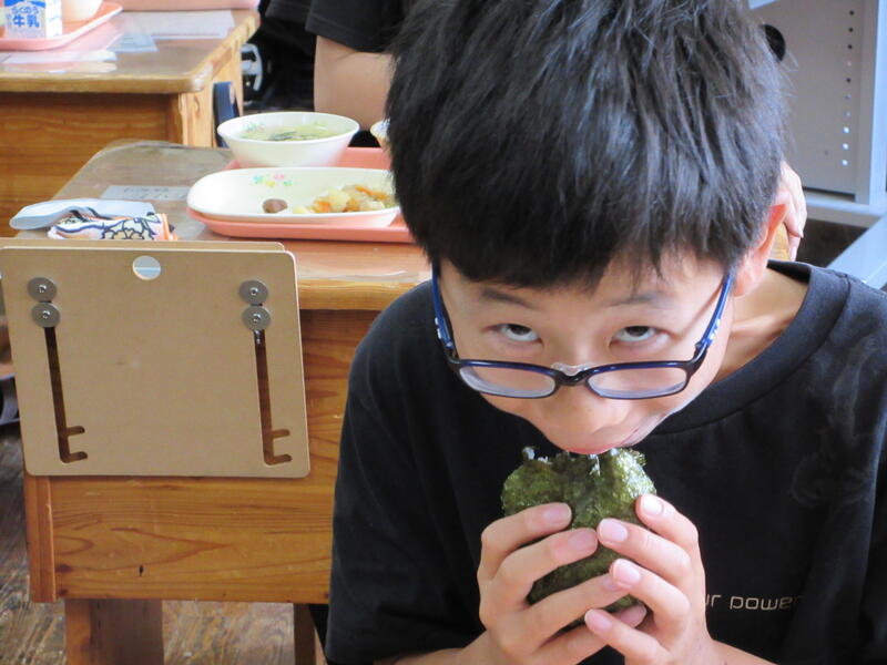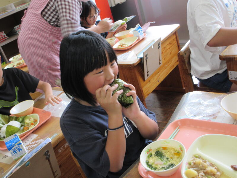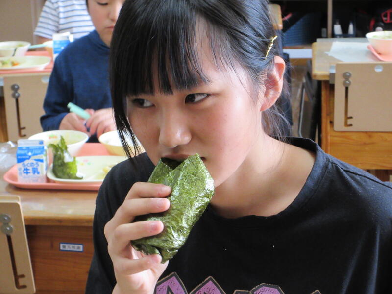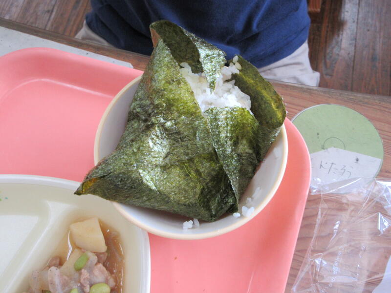 20日(金)の給食は、手作りおにぎりでした。今日ののりは、おにぎりにしやすい工夫があり、「袋に穴をあけ」「ご飯を載せ」「梅干しを入れて」「四隅を引っ張って」「丸めて形をつくる」という作業がしやすくなっていました。作り方がわからないときは、友だちに教えてもらって作っていました。できあがった形は、「三角」「四角」「まん丸」「おせんべい方」と、それぞれにちがっていました。中には、おにぎりにせずに、のりをちぎっておいしそうに食べている子もいました。おいしかったし、楽しい給食でした。