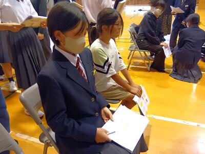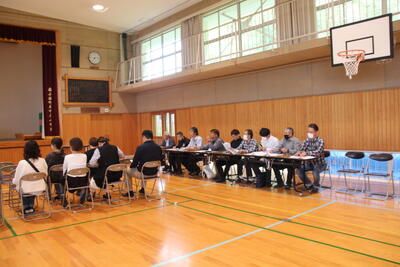 5月20日(火)、参加する児童・生徒が南小国中に集まり、事前の全体研修会が行われました。まず、万博研修団長の岩切南小国町教育長から研修の目的や万博のスローガンなどについて話がありました。そのあとは、班の確認や万博見学予定表の作成などを行いました。 この研修は、小・中の児童生徒が一緒に活動する縦割り班で実施されます。この日の研修会で、中学生が優しくていねいにリードし、話を進める姿に、「さすが中学生だ」と感心しました。