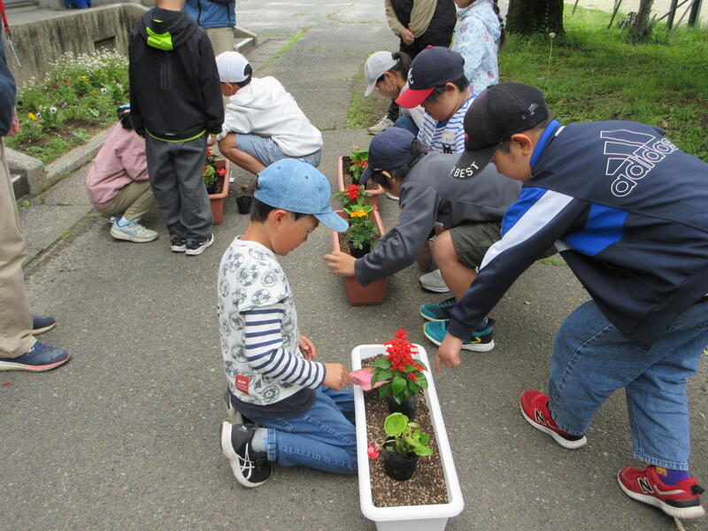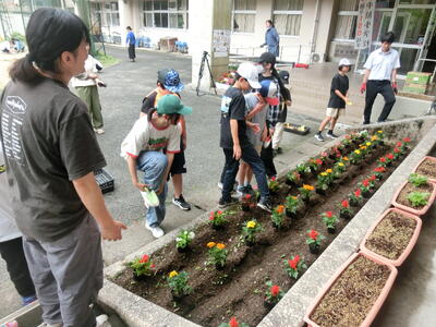 26日(月)の2・3校時に、小国支援学校との花の交流会がありました。花植えでは、植える花の並べ方を考え、上級生が下級生に植え方を伝え、協力しながら植えていました。