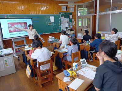 6月初旬の「歯と口の健康週間」にあわせ、養護教諭を中心に5・6年生を対象とした歯科指導が行われました。歯と口の健康に関する正しい知識を身につけ、歯科疾患の予防につなげてほしいです。