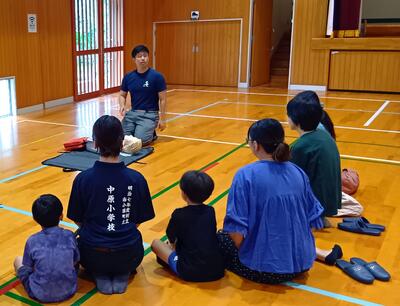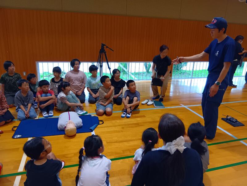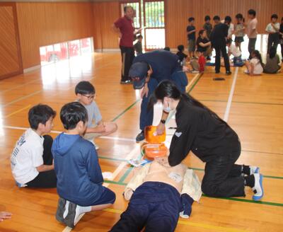 そのあと、体育館に移動し、阿蘇広域行政事務組合消防本部北部分署の方を講師としてお迎えし、救急救命法講習を行いました。「救命の連鎖の大切さ」「脳を守ることが大事」などのお話を聞いた後、実際に人形をつかって胸骨圧迫やAEDの使い方などの訓練を行いました。講習で学んだことを胸に、安全なプール使用を進めていきます。
