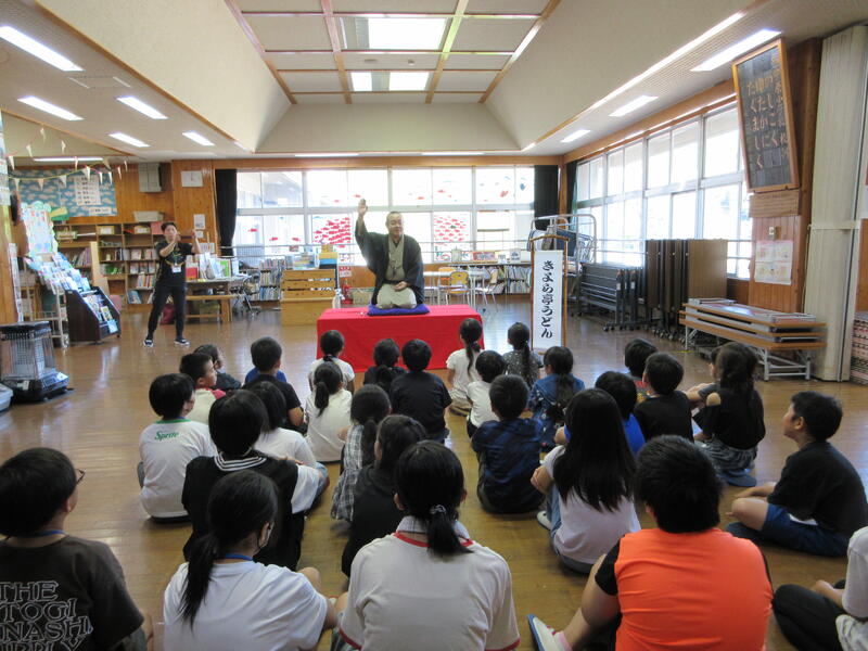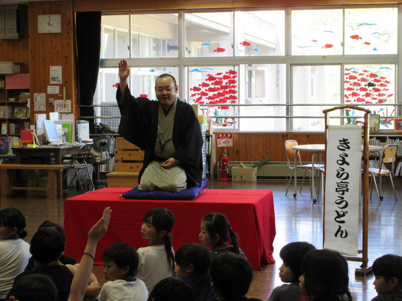 6月17日(火)の放課後子ども教室で、中原小学校の多目的室に、落語家の方がやってこられました。その人は、きよら亭うどんさん。1年生から6年生までいるということもあり、多くの人に受け入れやすい「じゅげむ じゅげむ」の話をしてくださいました。