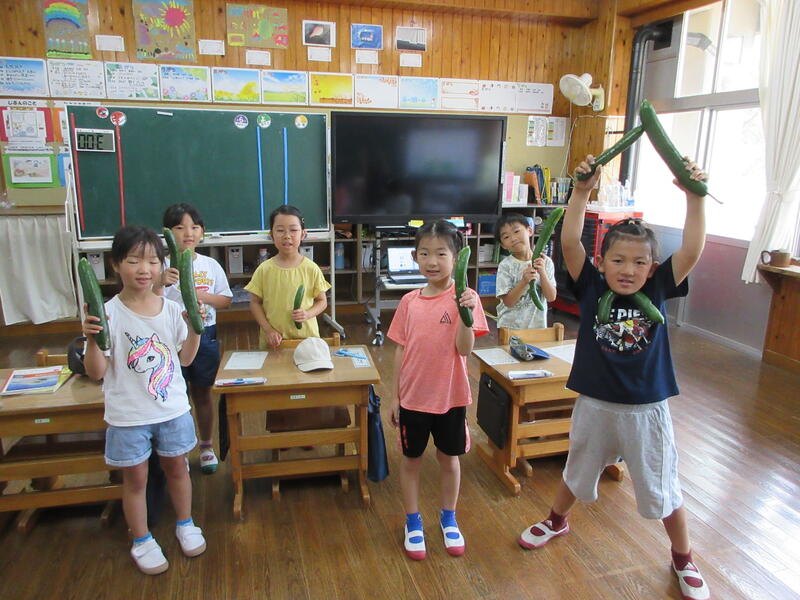 春に全学年で植えた稲、さつまいも、そして、1・2年生が植えたきゅうりなど、大きくなったり、収穫できたりしています。3・4年生が植えたツルレイシ(にがうり)も成長しています。花の水やりも、子どもたちはがんばっていて、花もきれいに咲いています。4枚目の写真は、1・2年生が、朝から大きく育ったきゅうりを収穫して、喜びいっぱいの様子です。