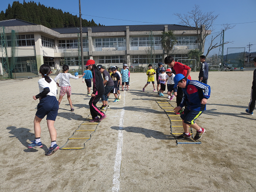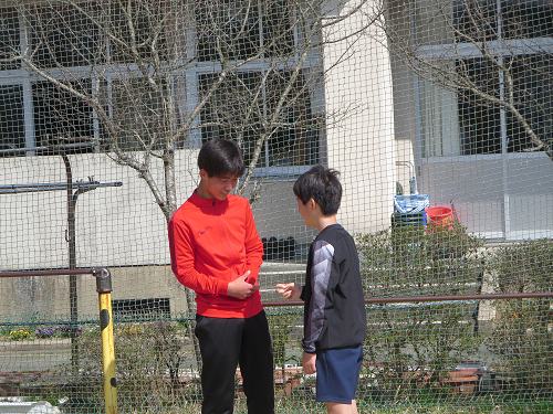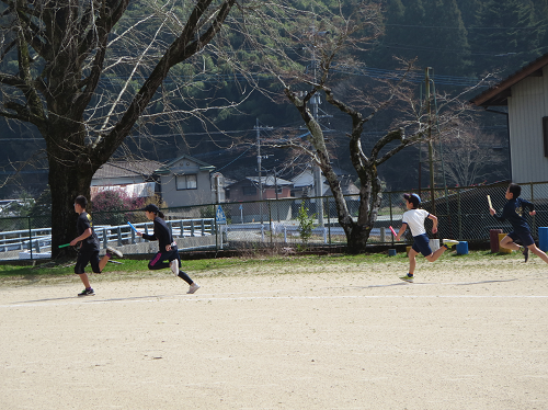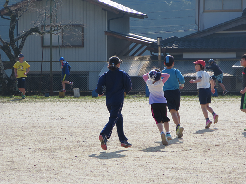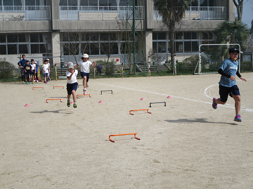 「ほ」(保)育園の卒園式(3月27日)に出席する校長先生が運動場をとおるとき、春休みの第1回かけっこ教室が始まっていました。