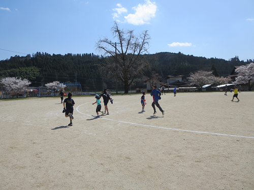 4月2日の午後、運動場で中学三年生から保育園の年中さんが一緒にいっぱい遊んでいました。