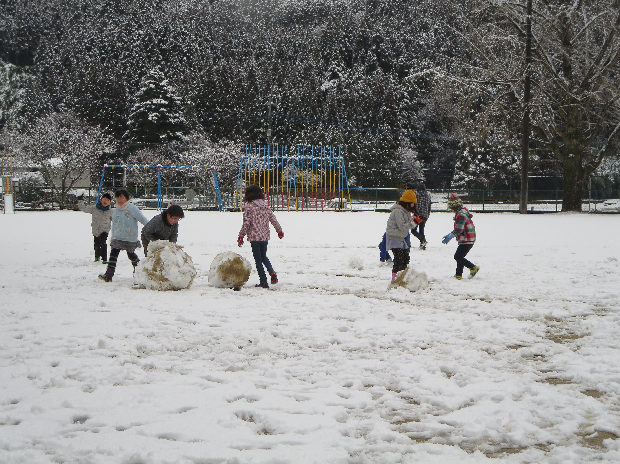 「て」(手)が冷たいけど、22日は湿り気のある雪がたくさん降ったので、雪遊びをしました。一気に降った時間も外に出て遊びました。
