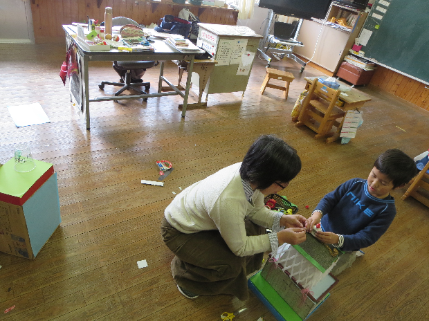 休み時間に何をしているのかな?と教室におじゃますると、授業で使ったカードが黒板の下の箱に入っているのを、出していました。