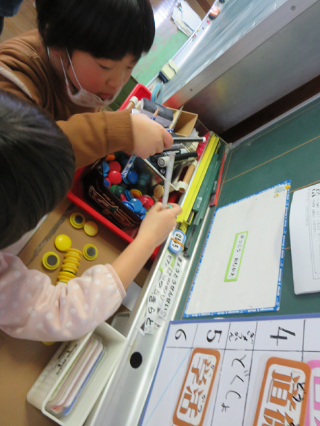 あさがおのたねで、10のまとまりをつくるのを見て、本やくつばこ、磁石などを数えました。