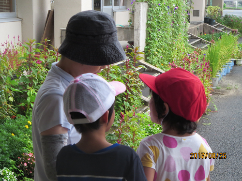 2年生のお兄ちゃんが、妹たちをおんぶして、おうちに入っていくのを見ながら