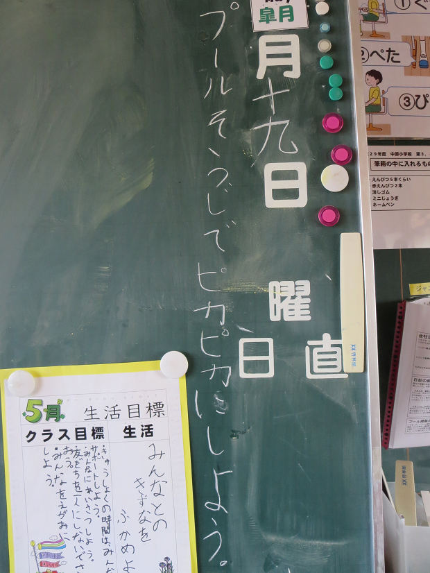●「時間割」教室の黒板にはいつも、その一日のイメージを、子どもはもちろん、入室し た誰もが共有できる、時間割があります。