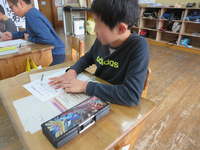 校内めぐりの学校探検をしてから、1年生の子のおばあちゃんが講師になっての『絵手紙作り』をしました。