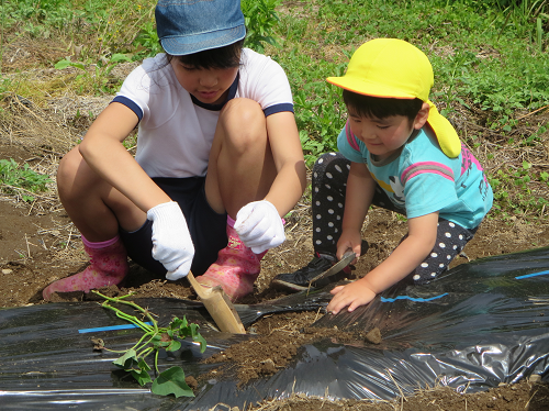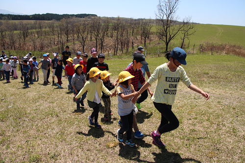 2年生と1年生、それぞれ歌いながら先生と一緒にしています。