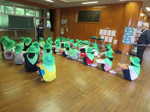 防犯ブザーや安全ベストの確認をしたあとに進行の6年生が「帰りのあいさつ」と言った時に、さっそく学習したことをいかしてあいさつをして帰りました。