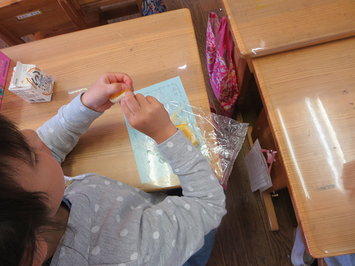 朝のけっこう早い時間から「おなかすいた。」「早弁してみたい!」とか言う子もいましたよ。(おうちの方、どうもありがとうございました。)