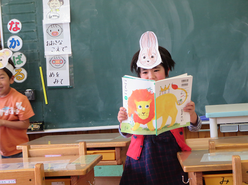 朝自習の時間(先生たちは朝の職員会議の時)、1年生の教室の『先生』は5.6年生です。