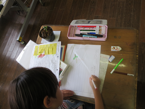 金魚の次は、自分の植えた枝豆の苗が成長している途中の記事を、今度は金魚の時の視点をいかして、自分で書きました。