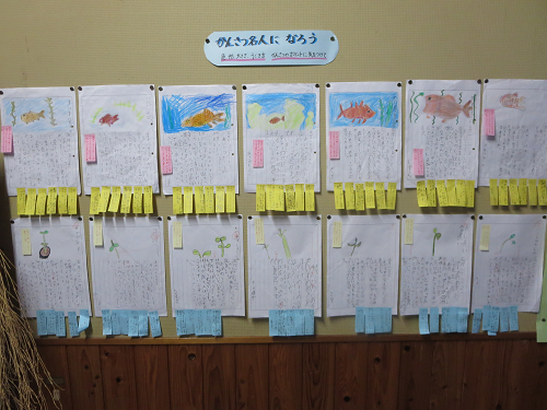 かんさつ名人を、お互いに読み合って、コメントを付箋紙に書いて交換します。