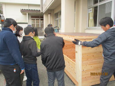 1月30日(火),緑の少年団立ち上げにご尽力された上島さんの計らいで,立派な「空き缶回収箱」を寄贈していただきました。制作していただいたのは,中原小校区でたいへんお世話になっている河津製材所さんです。お忙しい中しかも寒い中に,トラック及びリフトで運んでいただきました。今後6年生が,卒業制作として色等を付け,仕上げていく予定です。地域のみなさんのために大事に活用させていただきます。ありがとうございました!