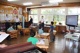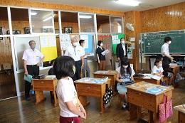 7月14日(水)、熊本県阿蘇教育事務所の先生方に学校と子どもたちの様子を見ていただきました。子どもたちは少し緊張していました。このような機会を通して、緊張する場面で堂々と発言したり、活動したりすることで、「自分の住む地域に誇りを持ち、社会の中で自分の力を発揮できる子ども」「課題解決への道筋を自分で見つけ、成長することができる子ども」を育てたいと思います。1年生は道徳「光るえんがわ」、2年生は書写「ひつじゅんのきまり」、3・4年生は「あまりのあるわり算」「少数のしくみ」、5・6年生は「図形の角を調べよう」「形が同じで大きさがちがう図形を調べよう」、かがやき2は「形も大きさも同じ図形を調べよう」という内容の授業が行われました。
