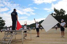 運動会当日、前日から心配された天候でしたが、朝から雨は降っていませんでした。曇り空のまま、大丈夫かなと心配はありましたが、準備が着々と進められました。子どもたちも、登校する表情はやる気に満ちていました。いよいよ開会式。そして、競技へと移っていきました。