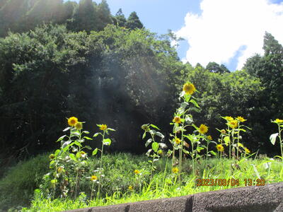 みなさん,毎日暑い日が続いておりますが,いかがお過ごしでしょうか。中原小学校の夏休みの学級園や畑には,いくつかの野菜ができ,花も彩り豊かに咲いています。校舎裏の畑の入り口には,上島さんからいただいたひまわりが大きくなり,いろいろな大きさの花を咲かせていますよ。