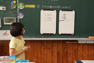 3年生は、「1000-3けたの数の筆算の仕方を考えよう」という課題に取り組みました。初めての4けたの数からのひき算、さらに3回の繰り下がりがある筆算でしたが、それぞれが今までの学習を思い出しながら筆算の仕方を考え、友達と説明し合うことができました。4年生は、「180°より大きい角度のはかり方を考えよう」という課題に取り組みました。分度器で測れない角度に対して、やはりこれまでの学習を思い出し、半回転(180°)や1回転(360°)の角度をもとに、角度のはかり方の工夫を導き出すことができました。課題解決に向かって真面目に取り組んでいました。どちらの学年も担任が他学年の指導をしている(間接指導)とき、自分たちで話し合いを進めたり、活発に意見を出し合い、教え合ったりしながら、意欲的な学び合いができていました。自ら学習を進め、課題を解決できたことは、子どもたちにとって大変自信になったようでした。