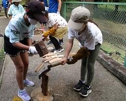 2日目は「焼き板づくり」を行いました。2人組になってナタを持つ人とトンカチでたたく人に分かれて薪を割る練習もしました。杉板を焼いて磨いて絵を描いて仕上げました。班の友達と協力して、楽しく活動しました。貴重な経験と楽しい思い出ができました。
