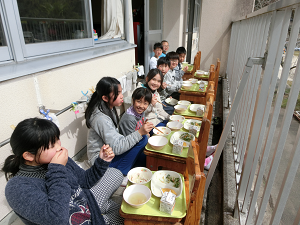 食育の日(毎月19日)に、なかよし給食(Ⅰ:全校会食 Ⅱ:教室で先生が入れかわり)をします。