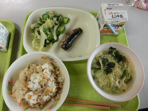 この日(5月17日 水曜日)の給食は、山菜おこわでした。