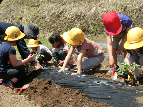 1年生担任が、休日に畑の準備で買い物をしていたとき、地域の方からお声かけいただき、「1年生で植えてください!」と、翌日「ひまわり」の苗を届けてくださいました。