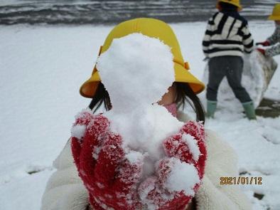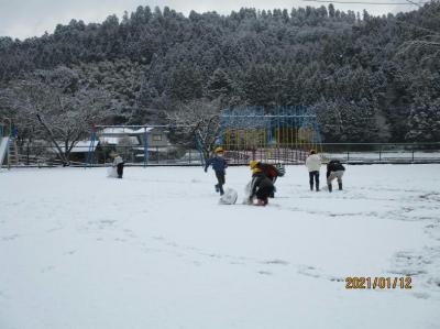 1月12日朝、起きると一面銀世界、まさかの「雪」でした。先週、大雪と言われていましたが、思っていたほど降らなかったので、今日の朝もまたまた油断していました(-_-;)。学校へ行こうと外に出て、初めて気がつきました。けっこう積雪のなかに、足がズッシリと入りました。車の運転もゆっくりのスピードで、学校に着きました。運動場も雪が積もっていて、これは子どもたちも大喜びするだろうと・・・予感しました。