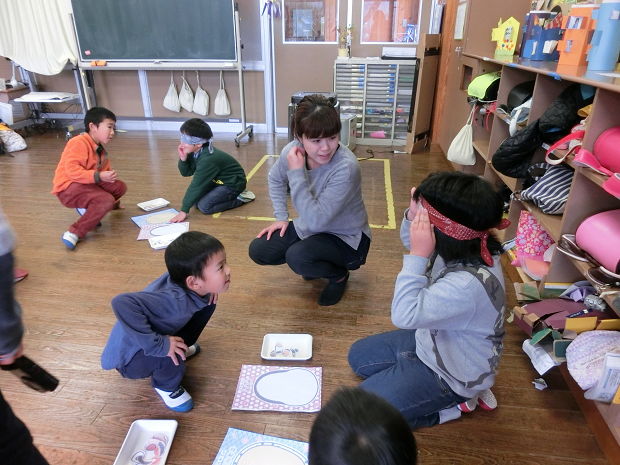 自己紹介の後、クイズ、魚釣りゲーム、ボーリング、わなげ、ぬりえ、たからさがし、あみだくじ、全部手作りです。最近は休み時間も費やして、ずっと準備してきましたから。