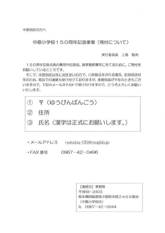 150周年記念事業に向けた寄付についてたいへんお世話になっております。中原地区にお住まいでなく,口座振込を希望される方に,下記の内容でお知らせをいたします。どうぞよろしくお願いいたします。