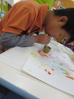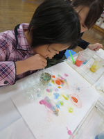 まずはシャボン玉で練習をしてから、こんどは画用紙に向かいました。
