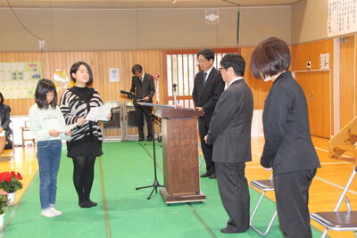 28日(木)は,退任式後,もう一つの卒業式が行われました。それは,35年間の教職生活を卒業される校長先生の卒業式でした。子どもたちによるエスコート,卒業証書授与,スライドショー,よびかけなどがサプライズで行われました。これまでお世話になった校長先生に心から喜んでもらおうと,子どもたちや先生方がそれぞれの役割をしっかり果たしていました。「この35年間いろいろなことがありましたが,今こうしてみんなを見ていたら,また先生になりたいなあと思いました」とおっしゃる校長先生の言葉から,「学校の先生」の本質を最後の最後まで見せていただくことができ,感動をたくさんいただきました。ありがとうございました。
