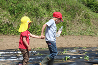 PTA会長さんに畑の耕運をしていただいて、5.6年生がマルチはりをして、5月24日の2時間目に、保育園生と一緒にさつまいもの苗を植えました。