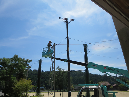 運動場では傷んだ防球ネットの支柱の工事もしてくださっています。