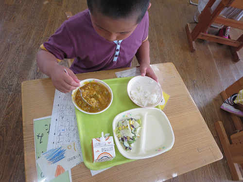 タイトル「いっしょにね きゅうしょくたべたよ うれしいな」