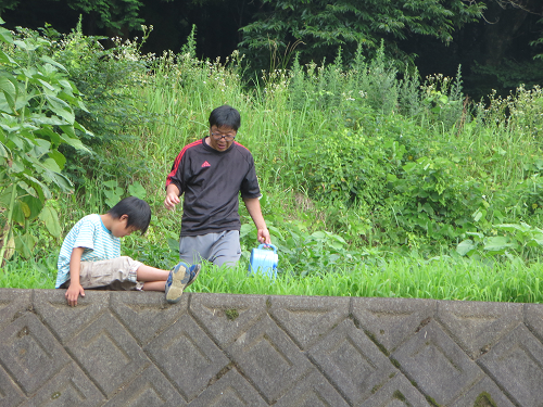 河津製材所見学の帰りに、二匹のおたまじゃくしを連れて帰った2年生。