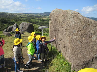 12日(木)は,1年生にとっては初めての3小合同学習が行われ,中原小校区内でもある「押戸石」へ出かけました。今回のめあては,「他の学校の友だちの名前を一人は覚える」でした。自己紹介をしたり,好きな食べ物を話したりしました。また,はさみ石やシュメール文字の残る岩のところを通り,みんなで写真撮影をしました。
