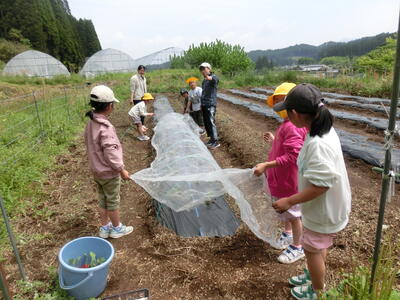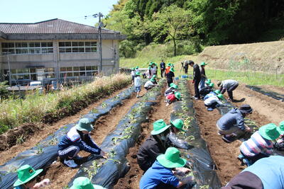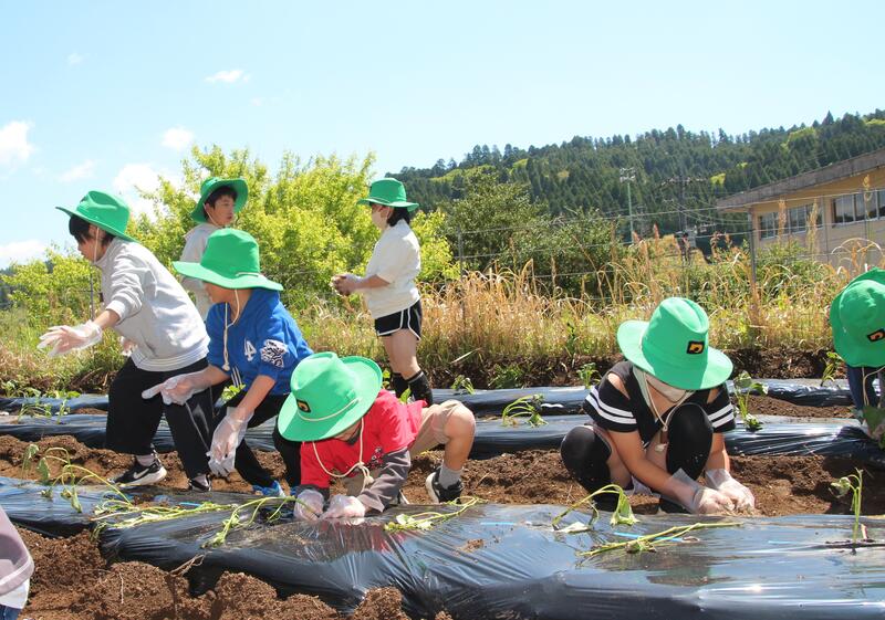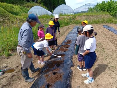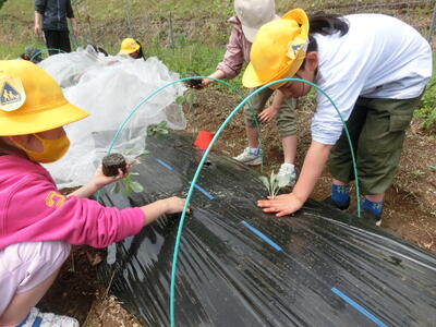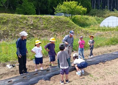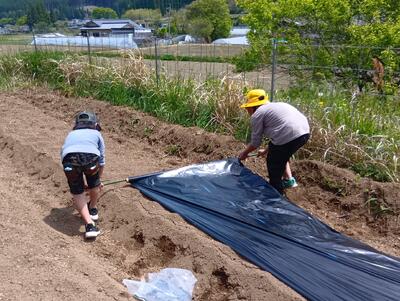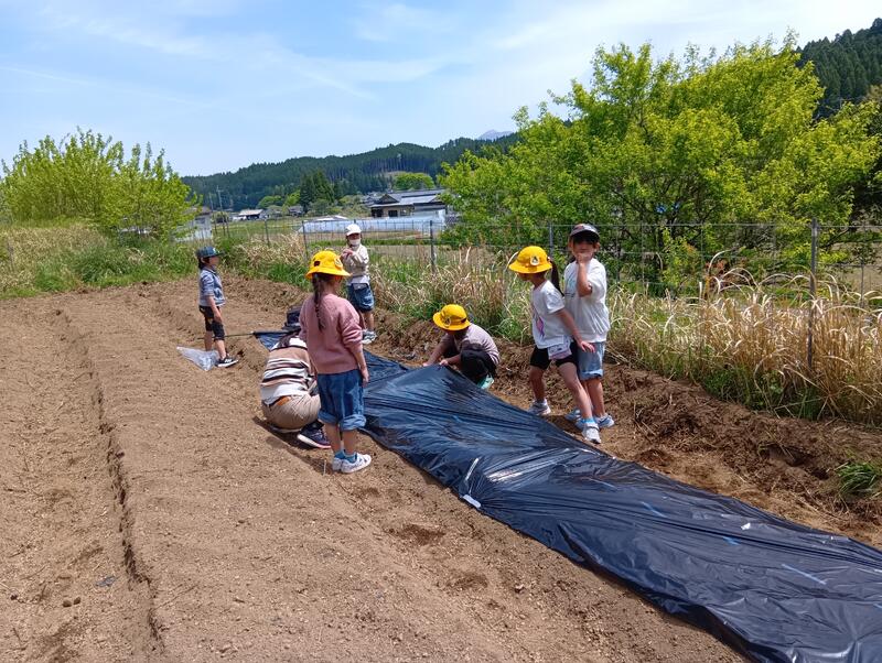 4月30日、保護者の方の協力のもと整備された畑に、1・2年生がマルチをかけてくれました。