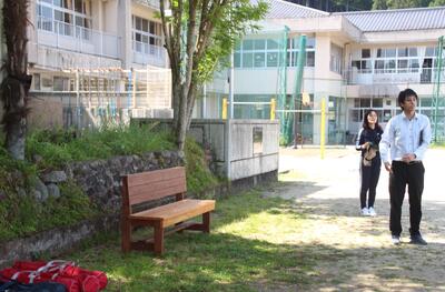 また、グラウンドゴルフ交流の前に、老人会の皆さまがグランドゴルフに来られたときなどに使っていただくため、3月に卒業した6年生が卒業記念品として作成したベンチのお披露目もありました。