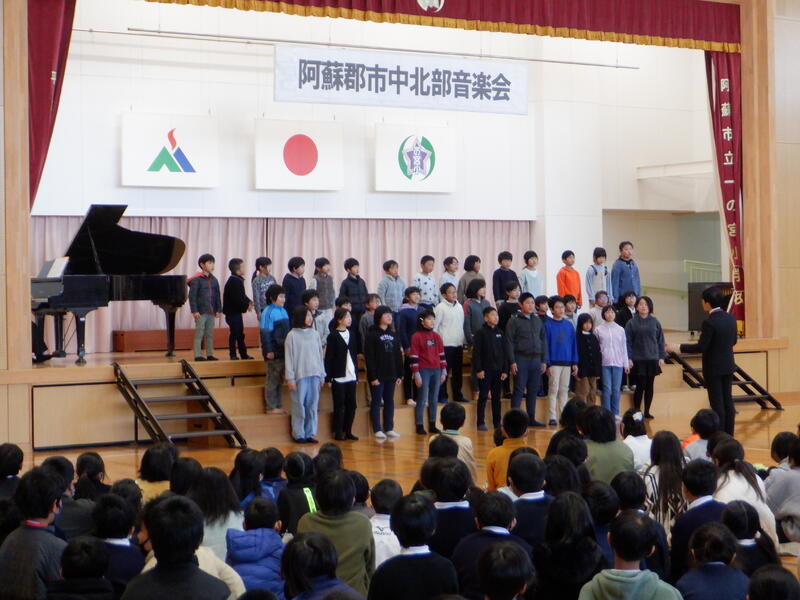 21日(火)に,阿蘇郡市中北部音楽祭が一の宮小学校で開催されました。子どもたちは,これまでの練習の成果を発揮し,「わらべうたメドレー」を堂々と合唱することができました。大勢の人の前でしたので,ぎんなん祭のときとは違った緊張感があったと思いますが,たいへん良い経験となりました。指導講評の先生からは,「わらべうたという難しい曲にチャレンジしましたね。声がまとまっていました。」という言葉をいただくことができました。音楽は,さまざまな場面で私たちに元気を与えてくれたり,励ましてくれたりします。これからも,音楽に親しんでほしいなと思います。