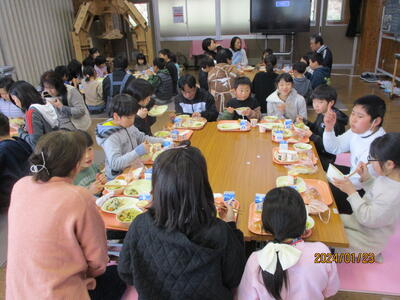 1月24日から1月30日までは,全国学校給食週間です。それに合わせて,南小国町では,今週22日から26日の給食では,給食が始まった頃の献立や地産地消の献立などが出されています。そんな中,1月23日(火)は,全校給食(給食集会)が実施され,栄養教諭の鬼塚先生にも来ていただき,給食の歴史や給食センターのお仕事の様子などについて分かりやすくお話をしていただきました。その後,縦割り班ごとに給食を食べ,なごやかな給食タイムとなりました。いつも食べている給食について,改めて考えるよい機会となりました。