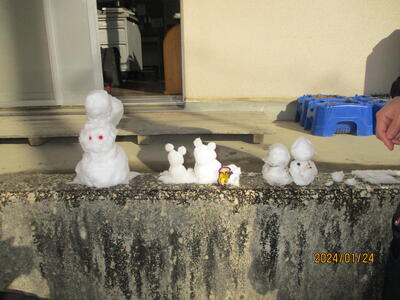 1月24日(水)は,前日からの雪が積もり,2時間遅れの始業となりました。子どもたちは,登校後すぐに外へ出かけて行き雪遊びを楽しんでいました。12月に降った雪よりも固まりやすい雪でしたので,丸めて雪合戦をしたり,あっという間に雪でキャラクターを作ったりしていました。今シーズン,あと何回雪が降るでしょうね・・・。
