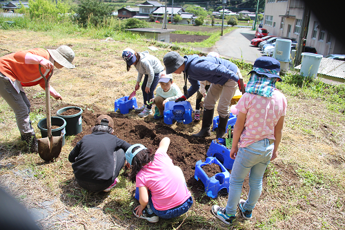 そのときに配られたヒマワリの種を植え、芽が出て、少し大きくなった苗をいただきましたので、1年生と2年生が植えました。