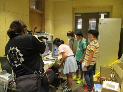夕方の町内放送で,子どもたちの声が聞こえているのではないでしょうか。夏休み前に,中原小の放送委員会の6年生3名(鞭馬さん,宮﨑さん,古賀さん)が,町役場の放送室へ出向いて録音をしたものです。役割分担をして,本番に臨んでいました。この日は,みなみチャンネル(町のケーブルテレビ)と町の広報紙の取材もあり,ちょっぴり緊張気味の子どもたちでした。