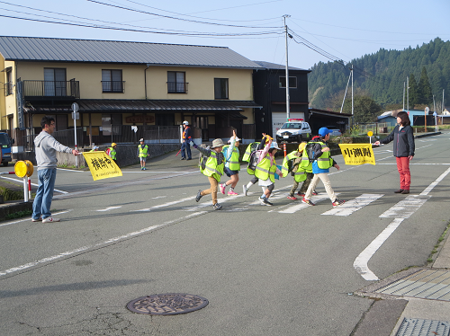 春の全国交通安全運動は、地域の婦人会、役場の方、PTA役員さんにもご協力いただいています。