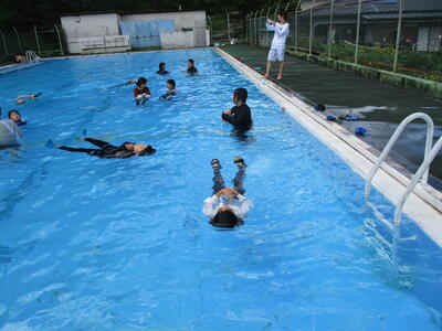 夏休みを前に、11日(火)のクラブ活動では、着衣水泳訓練に挑戦しました。衣服を着たまま水に入ると、たとえ泳ぎに自信のある人でも、衣服が重くなったり、水の流れに引っ張られたりします。そこで、3~6年生の子どもたちは、水の中で慌てずに体の力を抜くことやペットボトルを使って背浮きをはじめ体を浮かせることにチャレンジしました。水難事故に遭わないことが一番ですが、万が一巻き込まれた時には、このことを思い出し、命を守る行動をしてほしいと思います。